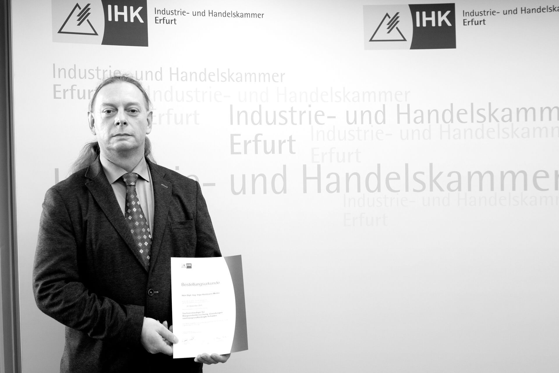 Am 22.02.2021 wurde Herr Dipl.-Ing. Ingo Hartmann-Müller von der Industrie- und Handelskammer Erfurt (IHK) als Sachverständiger für Baugrunduntersuchung, Gründungen und baugrundbedingte Schäden nach § 36 der Gewerbeverordnung öffentlich bestellt und vereidigt.